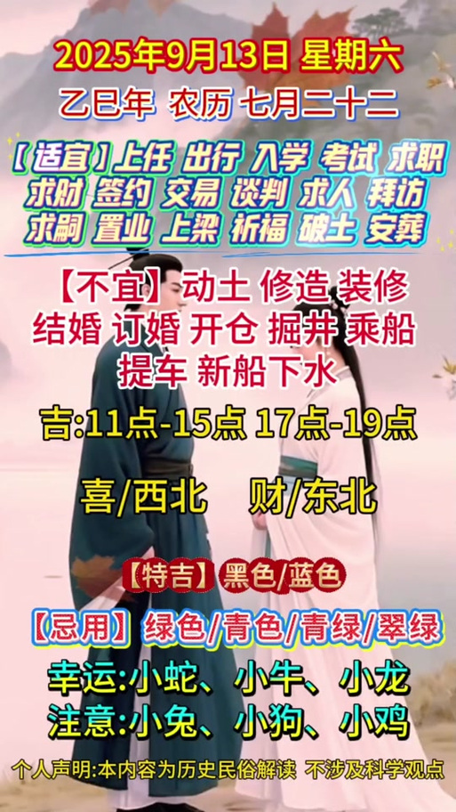 对于普通大众来说,9月13号是一个中规中矩、稳中求进的好日子、它没有那种惊天动地的吉兆,但也没有让人心惊肉跳的凶兆、在2026这个火马年里,这种厚实的土日子其实是一种难得的调节、它让浮躁的心能沉下来,让两个奔跑的人能停下来,扎扎实实地经营一个小家。