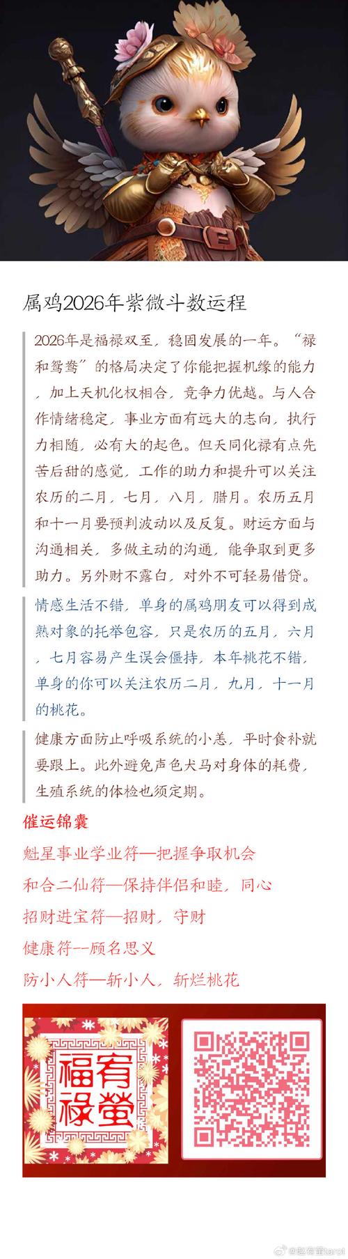属鸡人在2026年遇到了“正官”与“七杀”交织的年份、丙火为属鸡人的正官,主名誉、地位、权力;午火为属鸡人的偏官,主压力、小人、突发变故、这种官杀混杂的局面,意味着升职机会就在眼前,但伴随而来的竞争压力和职场是非也达到了顶峰、若手机号码中火性过旺(如含有过多的2、7),则会形成“火多金熔”,导致压力过载、精神焦虑,最终功败垂成。
