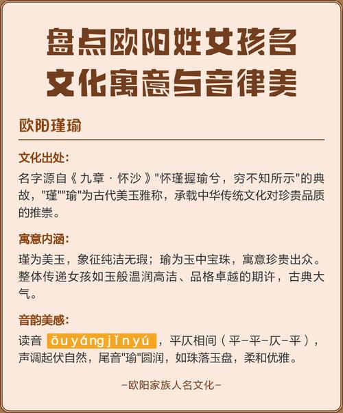 无论是欧阳廷宇的浩然正气,还是欧阳若兰的幽远清香,名字中所蕴含的精气神,都将成为孩子人生道路上最早的心理建设和风水护航、欧阳之姓,阳刚之气已足,起名时多注入一份柔美与智慧,方为乾坤合德,上吉之选。