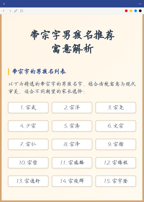 针对2026年出生的男宝宝,宗字多用于中间字,以彰显辈分或气场。