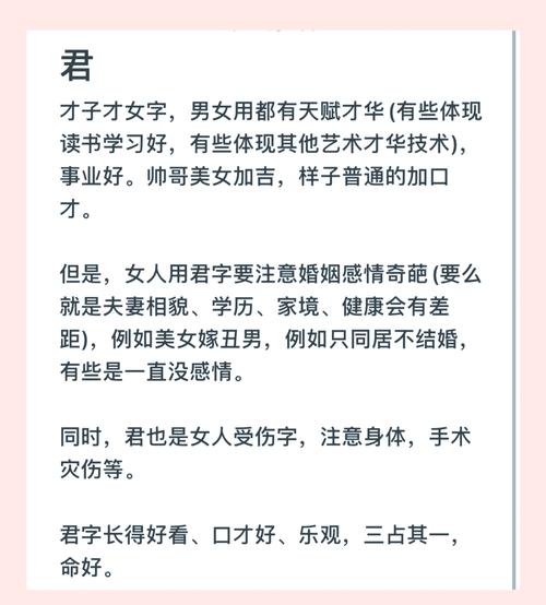 女孩取名“君”字,在现代社会中非常流行,体现出一种巾帼不让须眉的英气,但需避开过于刚硬的搭配。