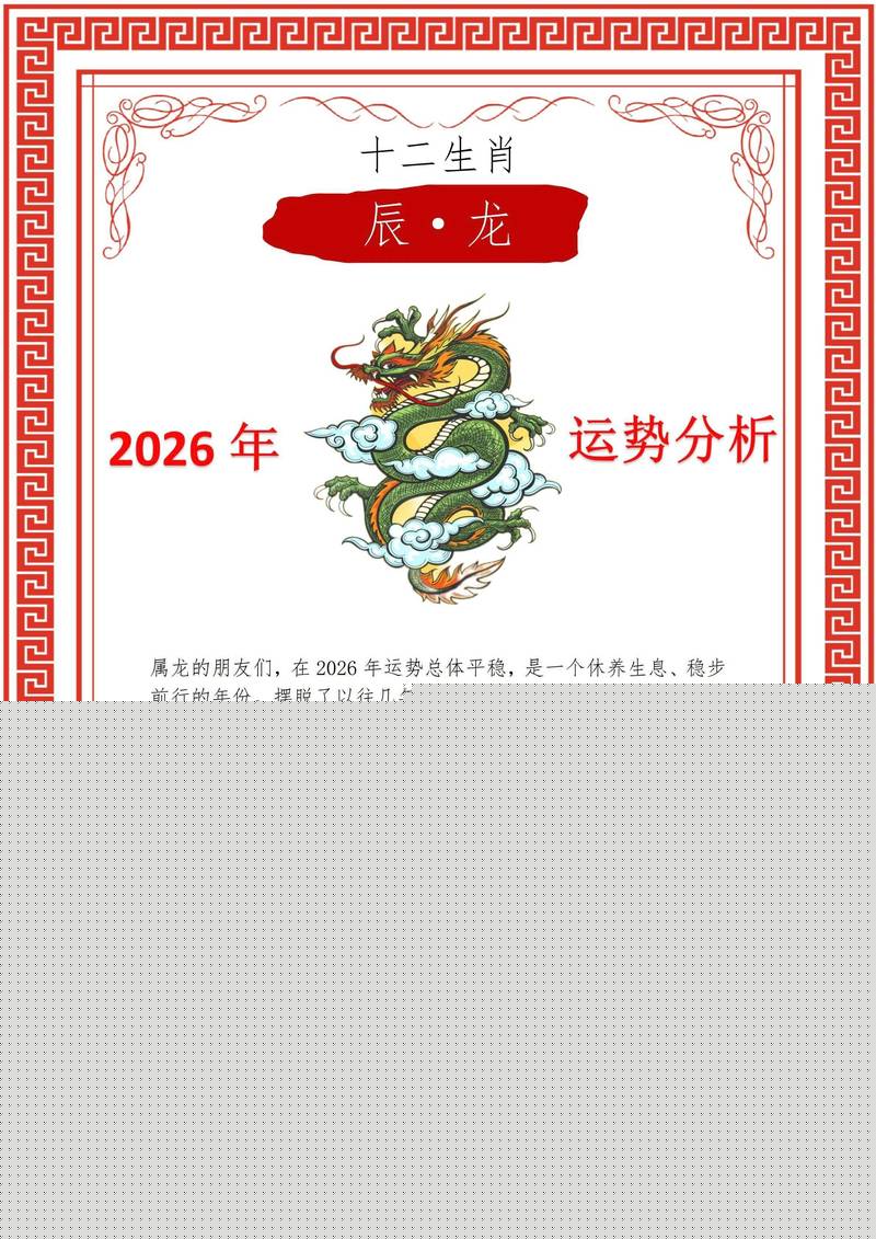 辰戌相冲,变数丛生、这个月是2026年最动荡的月份、工作环境可能发生突变,或是家宅出现问题、冲则动,不动则伤、建议属龙人主动求变,例如主动申请出差或装修房屋,以冲动化解凶力、注意脾胃健康,饮食要有规律。