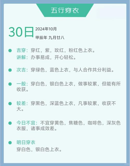 今日土气沉重,灵感易枯竭、建议大胆尝试青色与白色的混搭、比如浅青色的棉麻上衣配米白色裤子、这种配色能打破思维定式,利用木的穿透力击破土的围困,让创意如泉涌现。