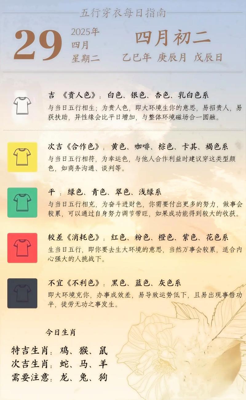 木生火,这两类生肖在午时容易感觉精神疲惫,因为自身能量被岁运过度抽取、宜选择黑色(水)来滋养木气,或者用浅黄色(土)来平衡火势、避免穿着过于亮丽的绿色,以防透支过盛。