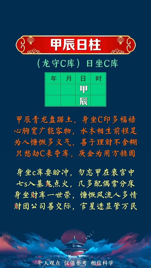庚辰日:坐魁罡、威严权赫,性格刚勇,适合武职或管理岗位,对配偶有压制。