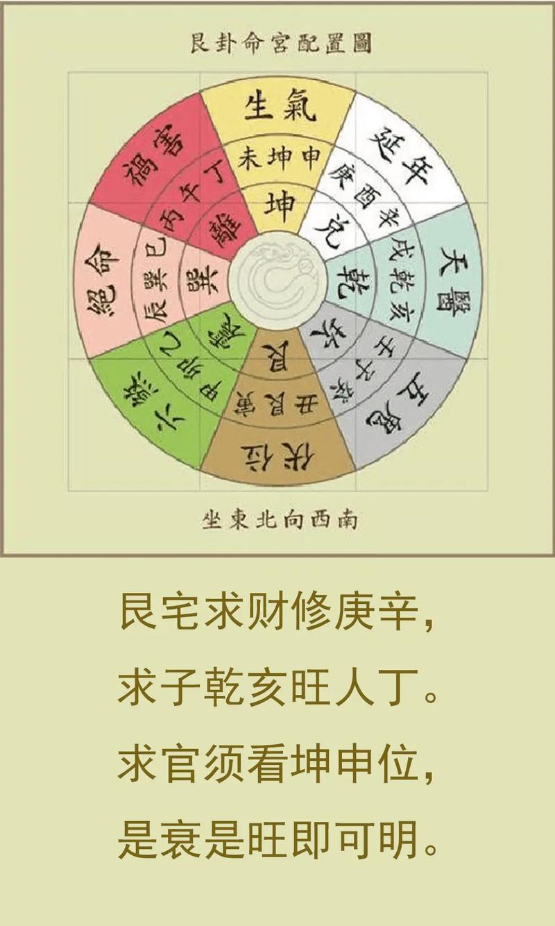 艮宅坐东北向西南,属于西四宅的范畴、在八宅风水理论中,艮宅的伏位在东北,生气位在西南,延年位在西方,天医位在西北、这四个方位构成了艮宅的四个吉方、相反,东方的六煞、东南的绝命、南方的祸害、北方的五鬼则属于凶位。