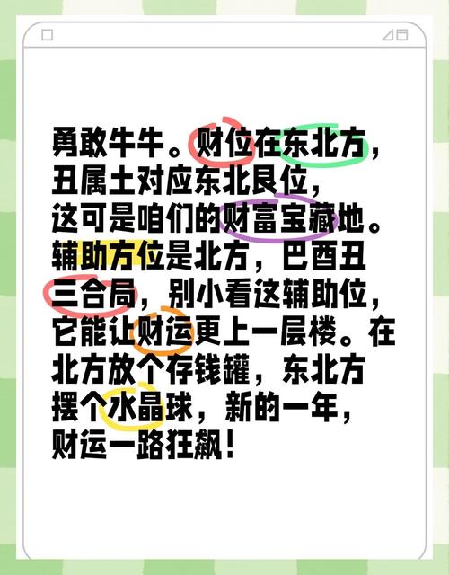 财运方位不仅是物理空间,更是色彩与五行的映射、属牛人今日在财位活动时,衣着色彩的配合能起到锦上添花的作用。