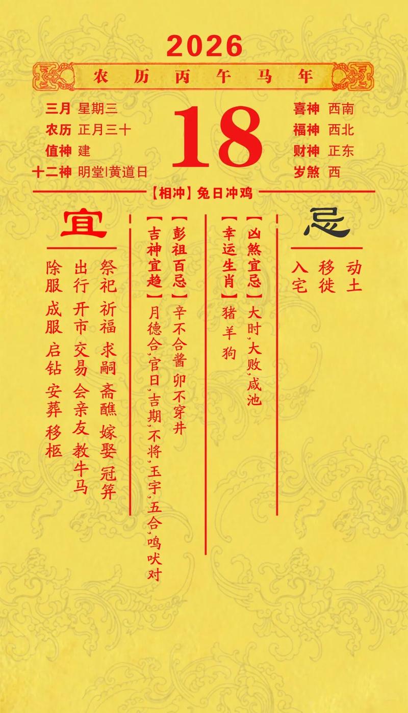 在民俗择吉学中,择日并非简单的翻看历书,而是要结合二十八星宿、建除十二神、紫白九星以及流年太岁的方位压制、2026年三月(公历3月1日至3月31日,涵盖农历正月十三至二月十四),正处于辛卯月与壬辰月的交替之际、惊蛰过后,木气极盛,火气渐起、三月十八这一天,公历对应为5月4日(农历三月十八),已入初夏壬辰月、以下将针对2026年公历三月以及农历三月两个维度的吉日进行详尽排布与解析。