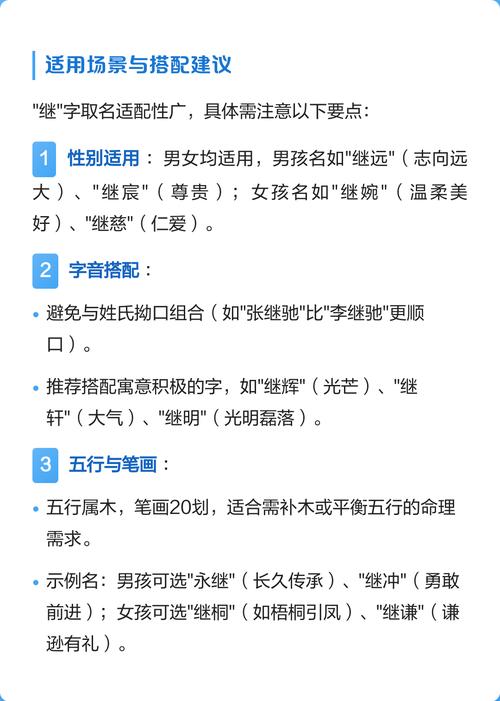 若“继”为中间字(如:继XX),末字建议选择平声(阴平或阳平),以舒缓去声带来的紧迫感,使名字整体听起来气韵悠长、若“继”为末字(如:X继),前字则宜选用更有厚度的字,形成一种“承托”之势。
