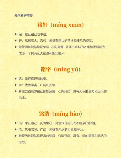 铭字由于是阳平,后面接一个去声字(第四声)会非常有力量感,如“铭赫”、“铭瑞”。