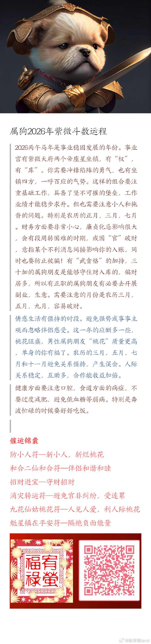 属狗人在2026年四月的运程查询,不应只看到“冲”的负面,更要看到“冲”背后的生命力、辰戌冲,冲出的是机遇,留下的是真金、在2026年这个赤马奔腾的年份里,四月的龙狗相争,不过是英雄出征前的一次磨砺、保持定力,方能致远。