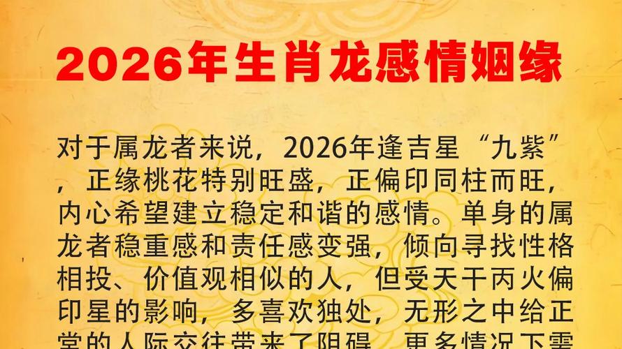 在这个充满活力的2026年2月,愿属龙的朋友们都能在感情的田野里,播下理解的种子,收获幸福的果实、不管世界如何喧嚣,你的心永远是那一处最宁静的港湾、对于单身者、恋爱者、已婚者,每一个属龙的人,这个月都是一次新生的机会、握住它,珍惜它,让爱在岁月的流转中历久弥新。