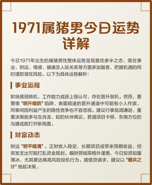 健康是1971年属猪男2026年最需关注的环节、从五行生克来看,辛亥年是水金相生,而2026丙午年是纯火之年、这就构成了典型的“水火交战”。