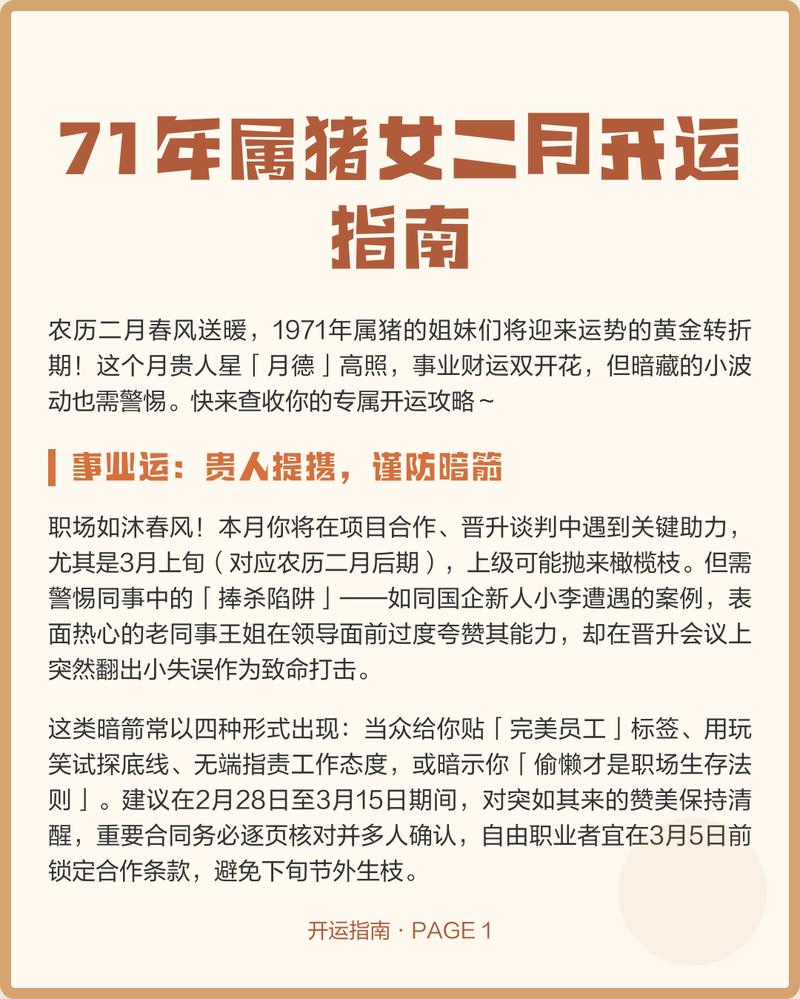 通过这一系列详尽的分析,1971年属猪人应当能对2026年有一个清晰的预判、运势只是天时,地利与人和仍掌握在自己手中、以从容之心应对丙午之火,必能化火为灯,照亮前行之路。