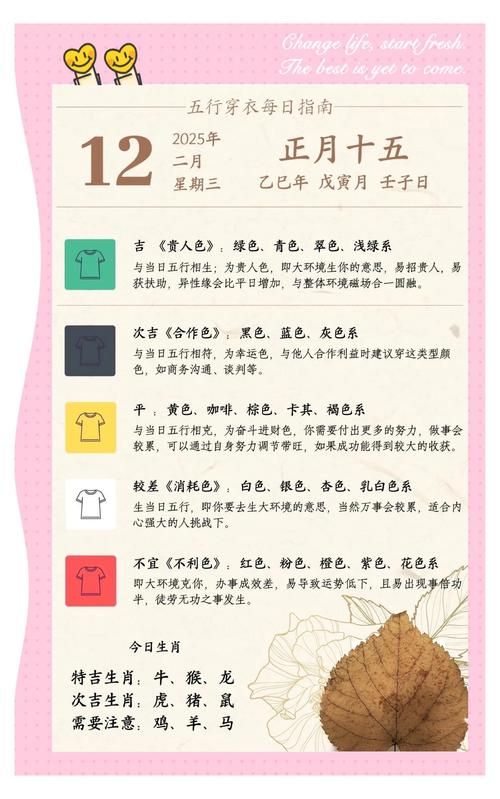 2月12日(甲申日): 木金日、金木交战、严禁穿全绿或全白、宜穿中性色,如驼色、灰褐色。