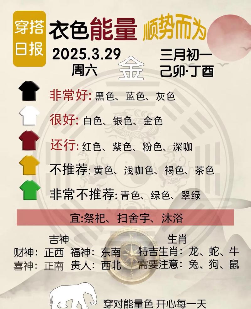 今日穿搭应避开大面积的正红色或紫色、红火克金,若穿得太红,容易引发情绪烦躁,甚至在人际沟通中产生口舌、最适宜的方案是“土以生金”、选择大地的颜色,如驼色、咖啡色、米色或是正黄色、土能泄火之烈,转而生金之气。