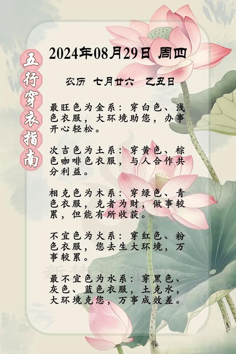 本月火气最盛之日、穿衣绝对禁忌红色、紫色、粉色、全力求“水”,如宝蓝色、藏青色、深黑色、今日宜静不宜动,衣着务必素雅冷静。