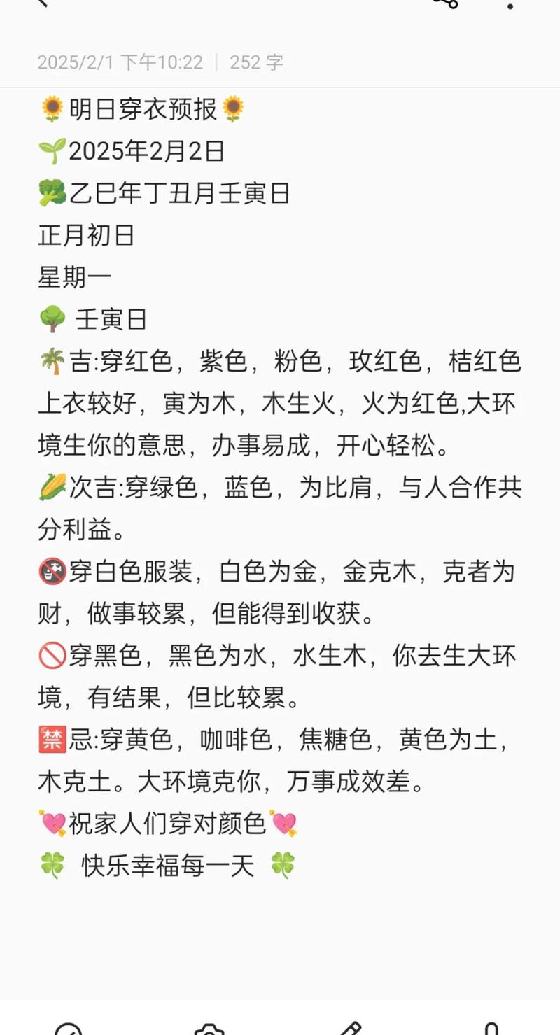 在具体的色彩搭配比例上,建议遵循“六三一”原则:六成主色调(如白色或青色),三成辅助色(如灰色或蓝色),一成点缀色(如金属配饰或小面积的对比色)、这种比例能确保能量场的稳定,又不至于显得单调乏味、记住,最适合你的颜色,永远是那些能让你照镜子时感到内心平静、充满力量的色彩、在这两日的火土博弈中,愿你以衣为盾,以色为引,化解戾气,收摄福报。