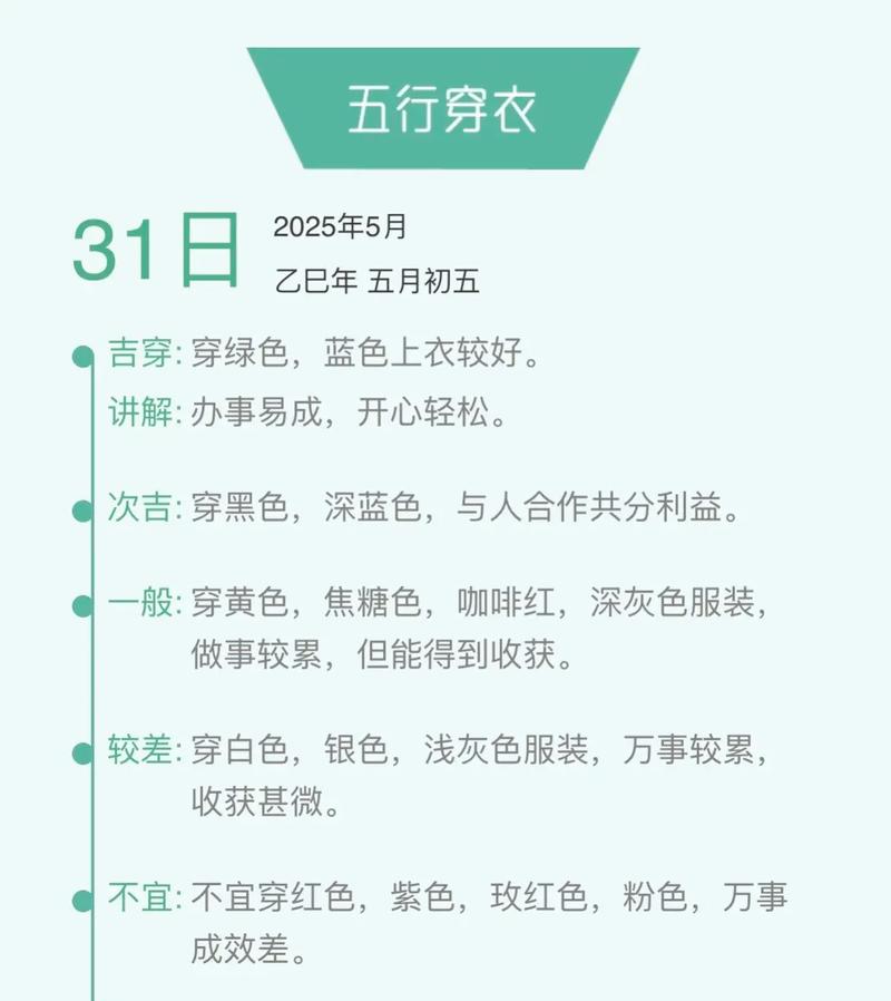 这篇关于2025年端午五行穿衣的深度解析,至此已将天时、地利、人和的色彩逻辑悉数拆解、每一个色彩的选择,背后都是对乙巳年气场运行规律的敬畏与利用、在未来的每一个端午,这种逻辑依然适用,只需根据当年的干支稍作流转变通,便能立于不败之地。