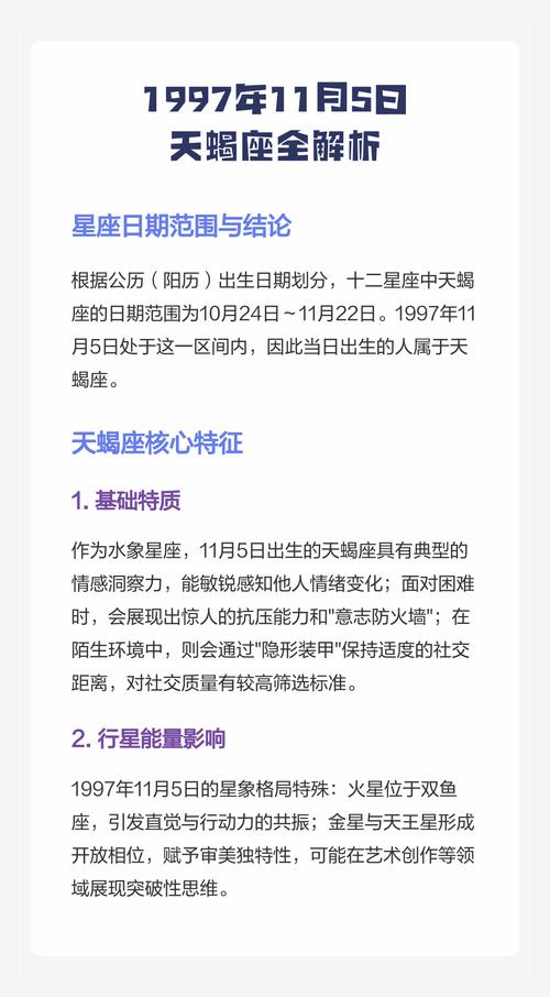 对于1997年11月5日出生的每一位朋友,这不仅是一个日期的记录,更是一段关于成长、磨砺与觉醒的生命密码、在2026年,去拥抱那场火,去成就那块金、你的星座赋予你深度,你的干支赋予你韧性、在这个丙午年,请展现出你最真实、最耀眼的一面。