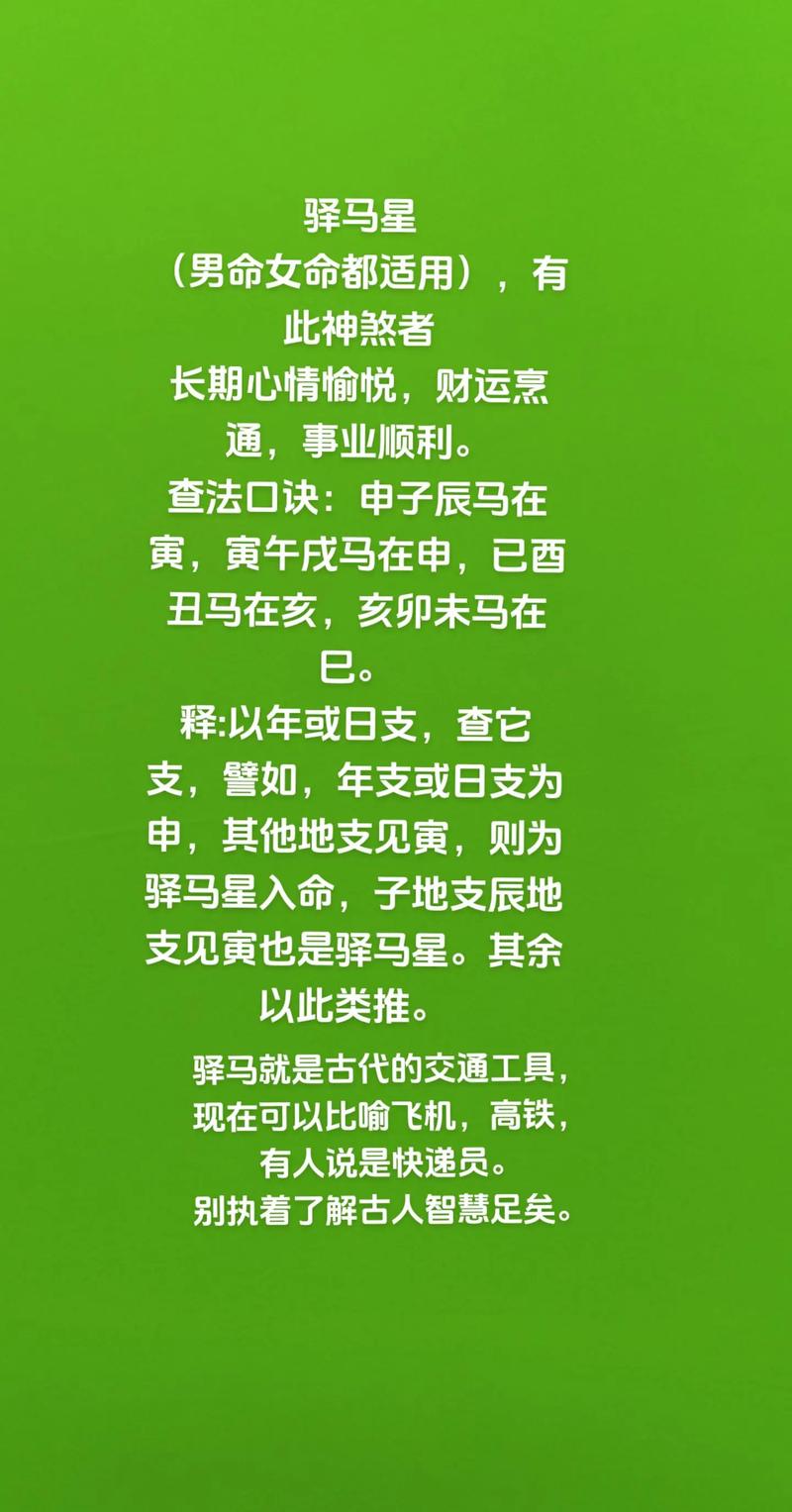 驿马星,在八字命理学中被视作动态之神,主迁徙、变动、奔波、出差、搬家以及职位调动、古语云:“马为走动之意”,在古代,马是主要的交通工具,因此命带驿马或岁运逢驿马,往往预示着生活环境或事业轨迹的重大转变。