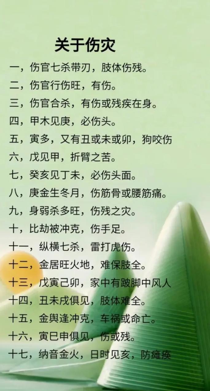 人的行为模式也是伤灾的诱因、命带羊刃者好胜,命带伤官者好奇、若能在岁运不利之时,通过内省压制性格中的缺陷,便能化解五分煞气。