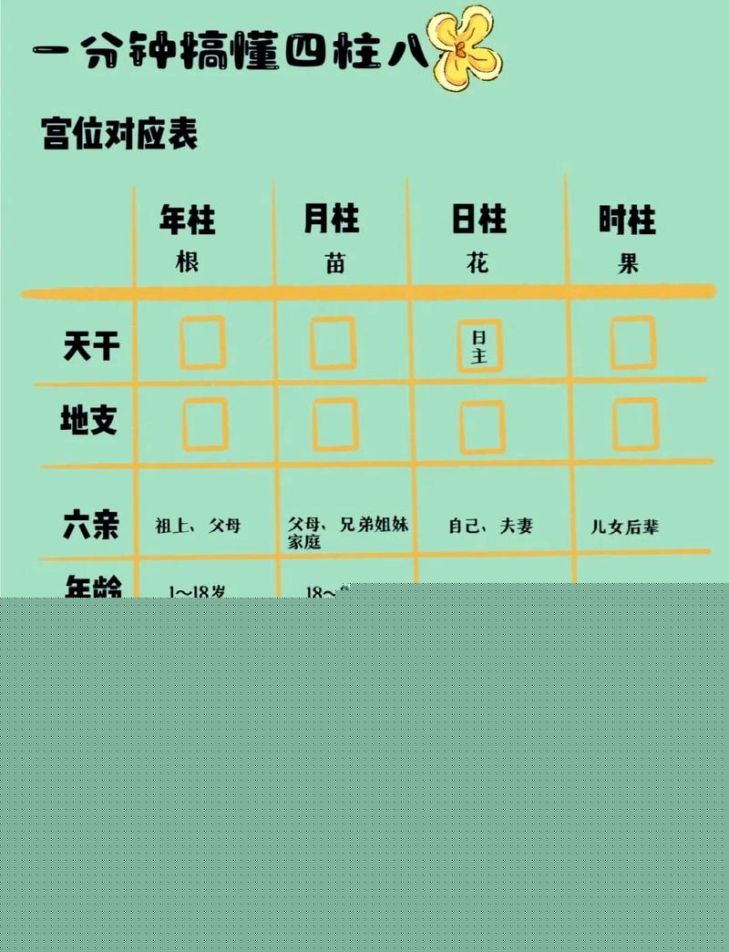 日柱(花):日干(日主)代表命主本人,日支代表配偶宫、中年(33-48岁)的运势大多在此体现。