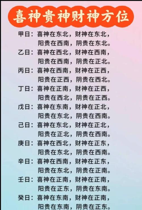 喜神之位,定于天干、凡甲、己日,喜神在东北(艮位);乙、庚日,喜神在西北(乾位);丙、辛日,喜神在西南(坤位);丁、壬日,喜神在正南(离位);戊、癸日,喜神在东南(巽位)。