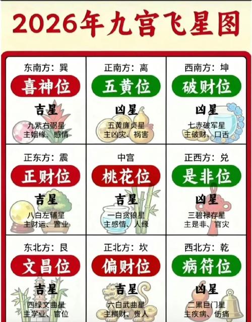 九紫星在离火运中属于生旺之星,2026年飞临东南巽宫、巽宫属木,木火相生,此方位是全家最吉之位。