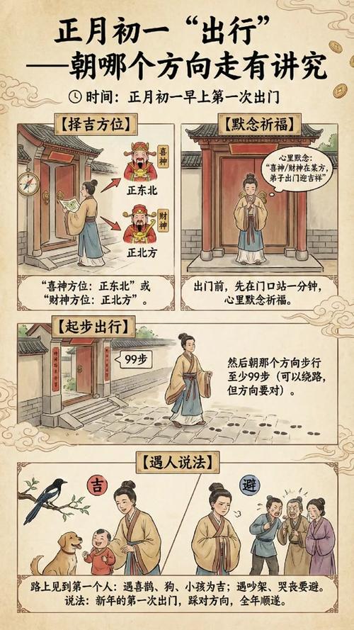 当天清晨,建议从家门出发,先行向东南方向行走至少十五分钟,以此迎接九紫当运吉气、随后转向正东方迎接财神,此举可为全年财运定下基调、切记,初一当天不宜向正南、西北方向远行,否则易招惹岁煞,导致一年诸事受阻。