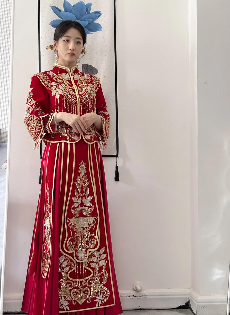 这是一天中火气顶峰、新娘的主纱应具有足够的厚度或存在感,以对抗正午的骄阳(即便在室内)、此时若穿大红色,需有白色或金色的内衬压底。
