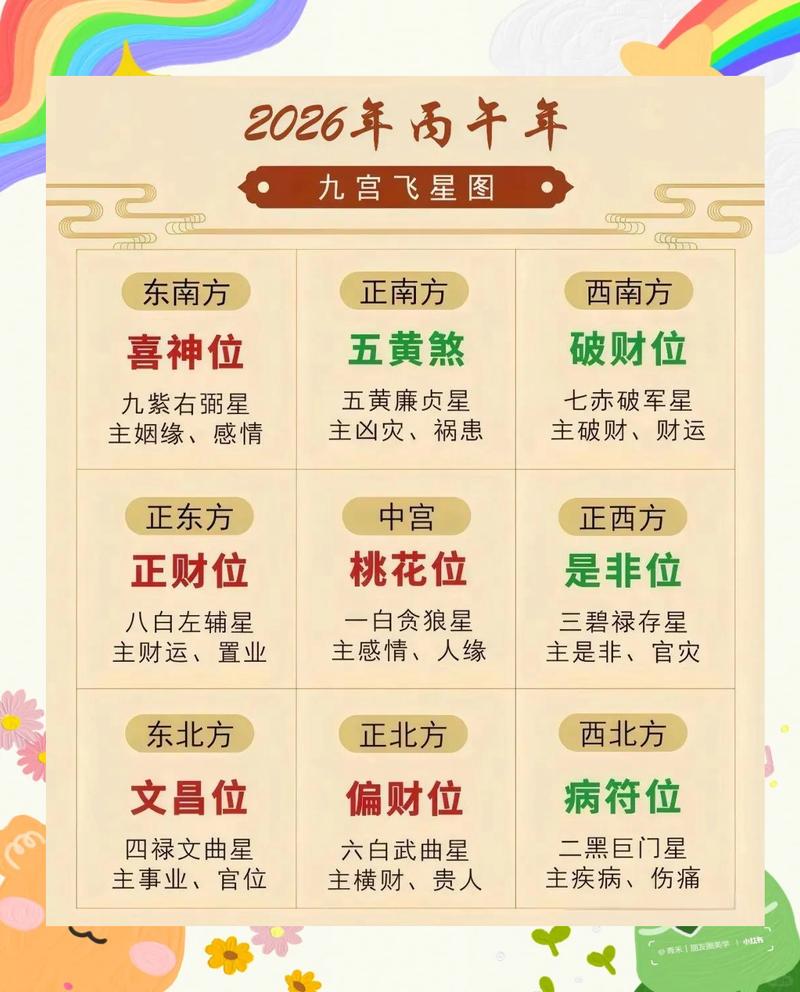 丙午之年,根据玄空飞星之法,八白左辅星飞临正西兑宫、八白星在八运(2004-2023年)为当旺大财星,进入九运(2024-2043年)虽为过气之星,但其积蓄的财气余威仍在,依然是催旺财运,尤其是正财与置业运的关键所在、故此,2026年全年,家宅、商铺、办公室的正西方,即为流年大财位、此方位宜动不宜静,宜净不宜乱,宜明不宜暗、保持此方位气场流通,光线充足,整洁干净,便是为财神爷预备了一处舒适的驻留之地,财气自然愿意前来。