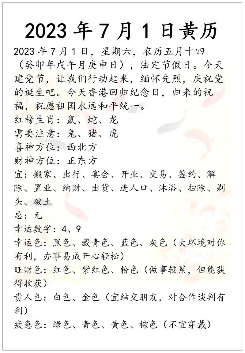 择日,是古人对自然规律的尊重,是一种追求和谐圆满的文化实践、它提醒我们,做任何重要的事情,不仅要靠自身的努力,还要懂得顺应时势,选择一个好的开端、一个吉祥的日子,如同一阵顺风,能为我们的航船增添一份助力,带来积极的心理暗示,让我们以更饱满的信心去迎接未来的挑战、在看待七月一日是否为吉日时,我们既要参考历书的普遍规律,更要结合自身的实际情况,做出最适合自己的智慧选择、最终,成事在人,吉日只是一个美好的开端。
