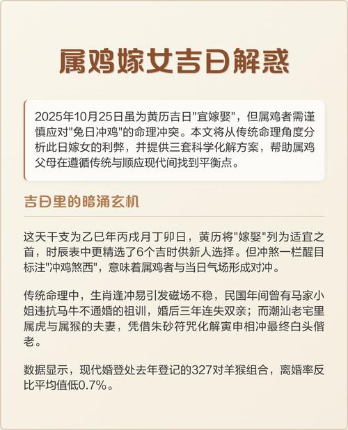 属鸡者婚嫁避讳的大原则是:首选巳(蛇)、丑(牛)、辰(龙)的合局日,以此增强自身的能量场;坚决避开卯(兔)日,因为卯酉相冲,此为“岁破”与“本命冲”,力量极大,容易导致婚后感情动荡或健康受损、同时要避开戌(狗)日,酉戌相害,意为口舌是非与外力干扰。