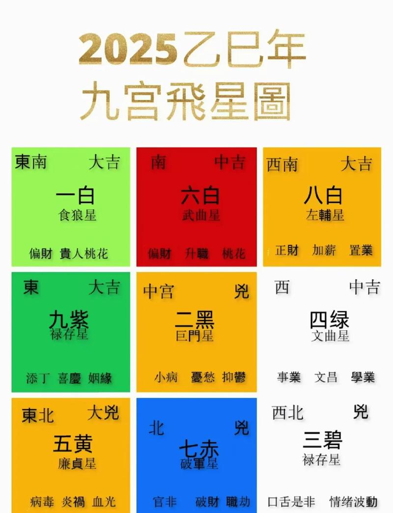 看懂飞星图,底色是九运、九紫离火星作为当旺之星,其所到之处,吉气最盛、原本在八运期间兴旺的八白土星,如今已成退气之星、一白水星、二黑土星在九运中性质发生微妙转化,一白为远旺吉星,二黑则由纯病符星逐渐向平性过度。