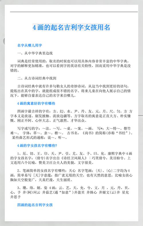 在这样一个充满变数与机遇的年份,名字的力量将愈发凸显、四画汉字以其特有的节奏感,为这个快节奏的时代带来了一丝宁静与稳重、这正是我们在取名时追求的境界——在动感中寻找平衡,在平衡中创造价值。
