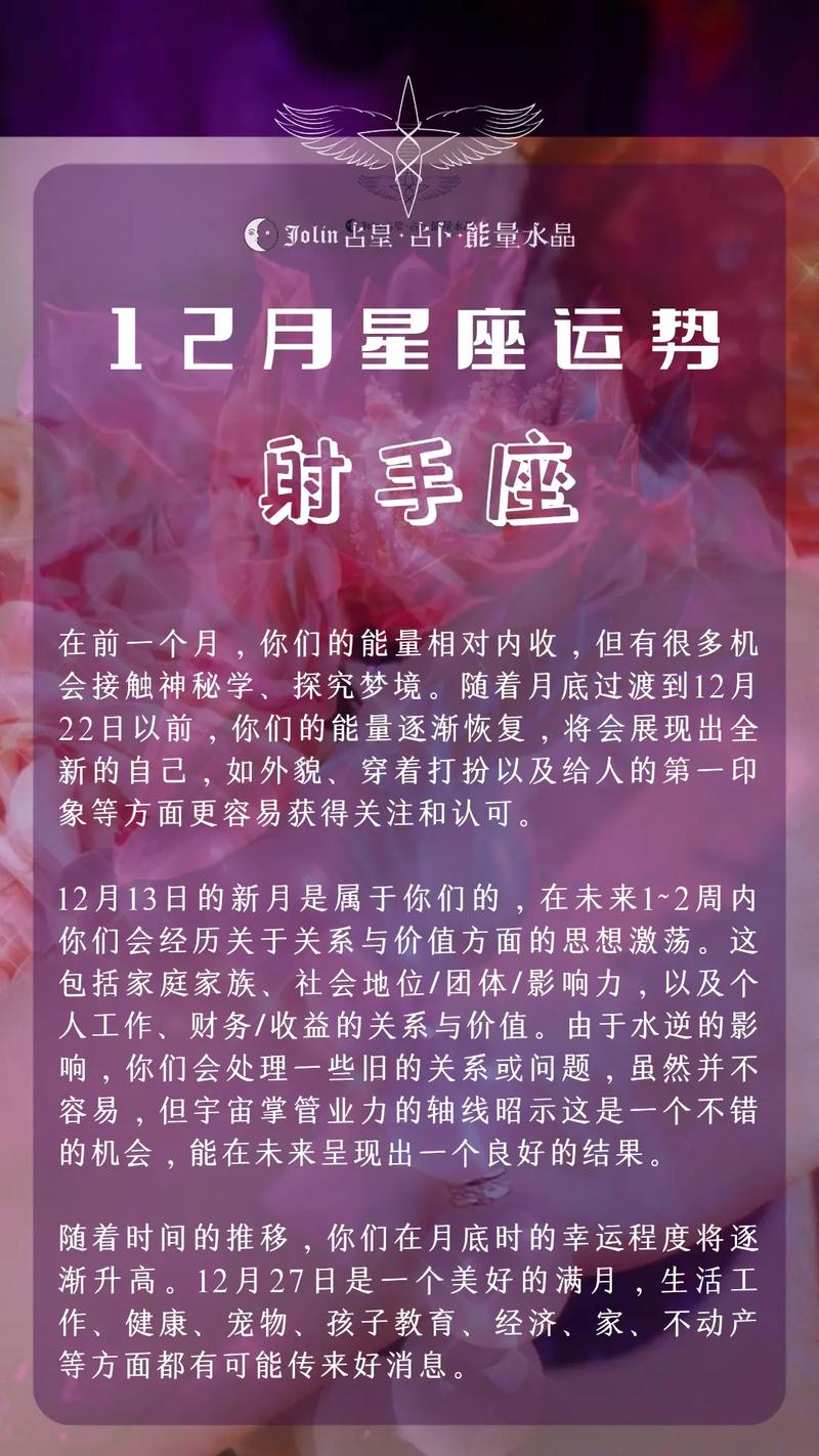 对于正在追求特定目标的属牛射手座,12月21日冬至之后,你的魅力值会有一个短期的峰值、如果有重要的约会或表白,请选在冬至后的第一个子日(可通过万年历查询)。