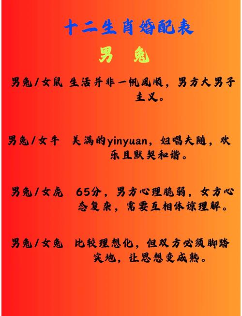 而与属鸡女、属龙女的婚姻,则可能在漫长岁月中经历了更多的磨合、鸡的直率与挑剔,时常会触碰到兔的敏感神经、龙的强势与主见,也可能让追求平和的兔感到压力、若能携手走到古稀之年,说明双方都已做出了巨大的包容与改变、晚年关系的好坏,全看双方是否真正理解并接纳了对方的本性。