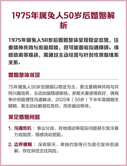 外部的诱惑亦是此年婚姻的一大暗礁、木火通明,乙卯兔人的魅力与才华得以展现,易吸引外界的目光与好感、在家庭内部沟通不畅、情感需求得不到满足之时,命主的心便容易动摇,稍有不慎,便可能陷入情感纠葛,为原本稳定的婚姻带来毁灭性的打击、维系婚姻之道,在于守心、当谨记夫妻同心,其利断金、遇有分歧,不妨暂退一步,冷静思之、闲暇之时,夫妻二人可共同出游,转换环境气场,或培养共同的兴趣爱好,重温往日情谊,以此巩固感情基石,方能安然度过此破岁之年。