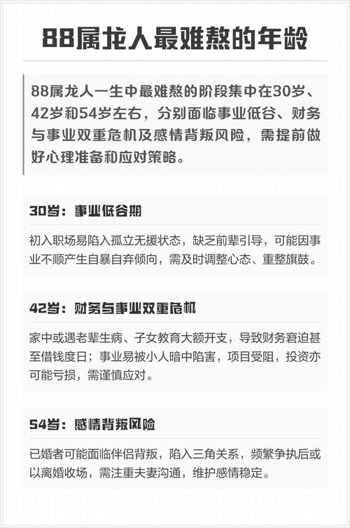对于88年属龙人来说,最难熬的年份其实不仅仅是一个时间概念,它更像是一场关于“自我成长”的考试、2030年的冲、2033年的破、2035年的害,这些年份在命理上虽然预示着压力,但从另一个角度看,也是迫使龙脱胎换骨的契机。