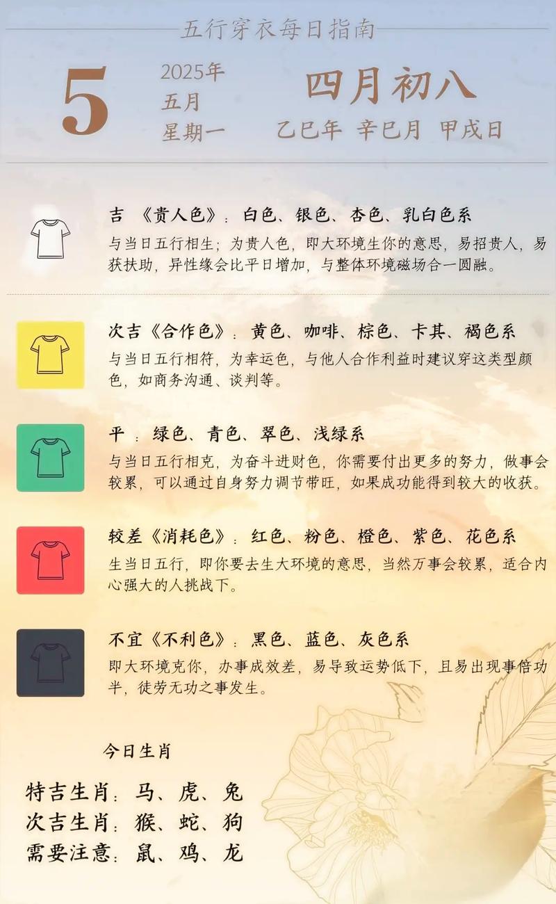 是日星宿亦有微调作用、若星宿能量与五行色彩相合,则吉上加吉、2026年5月25日,若逢吉星值日,红黄之色的穿搭将更能感应天地之灵气。