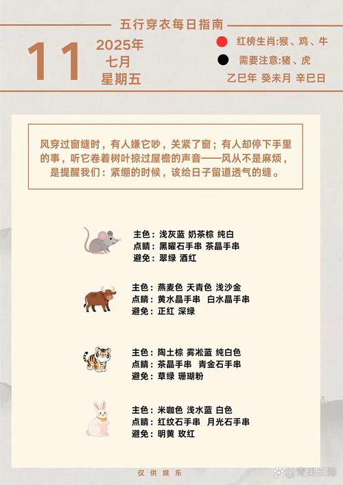 2025年7月,月令由壬午转入癸未、上旬壬午月,火气正旺,水火相济,社会活动频繁、中下旬进入癸未月,由于未土燥烈,癸水被吸纳,整体五行气场由活泼转向沉稳且略带压抑、此月土气极盛,未土作为木库,既能藏火又能收木、对于八字喜土、喜金的人群来说,此月多有晋升或得财之喜;对于八字忌土者,则需防范思维僵化、办事受阻、整个七月,木气受到严重抑制,凡事不可过于激进、在择日方面,应特别避开申、酉日对木的冲克,以及子、午日对水火平衡的破坏、每日气场虽有不同,但顺应天时,避其锋芒,方为趋吉避凶之道、本月五行重点在于“土水平衡”,处事宜宽厚,忌急躁,尤其在小暑与大暑两个节气节点,更应调养心气,以待来日。