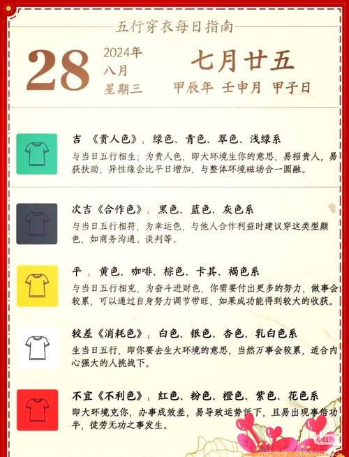 再次强调,2026年8月31日的穿衣重点:重用黄、咖啡、米、白、银;避开红、紫、绿、青、这不仅是关于色彩的指南,更是关于平衡与和谐的生活哲学、在丁未日,愿你穿出自信,穿出好运,穿出五行流通的极致美感。