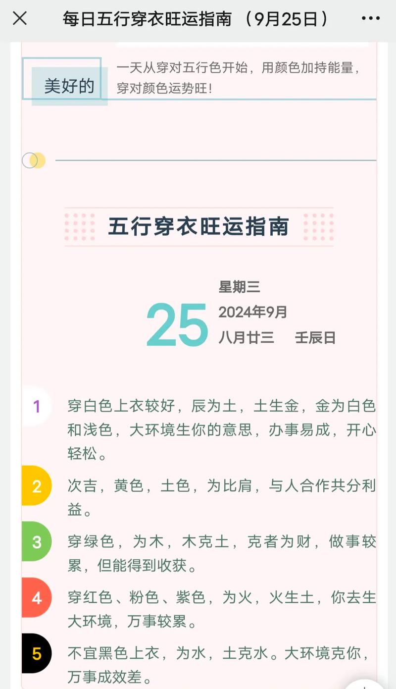 这一年的穿搭宜轻不宜重、为了化解西南位的湿热火燥,应多穿白色、杏色、浅金色、这三种颜色在光学的反射率最高,在五行中也代表了最纯净的金能量。