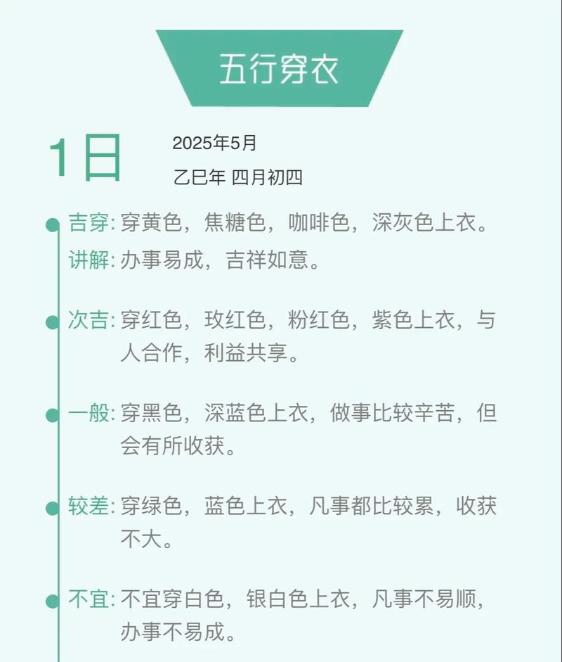从颜色选择上看,这一天避讳大面积的绿色与青色、木多火塞,或是火多木焚,都会导致情绪易怒、急躁、若穿着正绿色,容易在旅途中遇到口舌之争、最宜使用的颜色是黄色、咖啡色、米色等土系色调、火生土,土能泄火之烈,也能耗木之气,达到一种平衡、穿着土系色彩,能让人在奔波中保持冷静,守住财运。