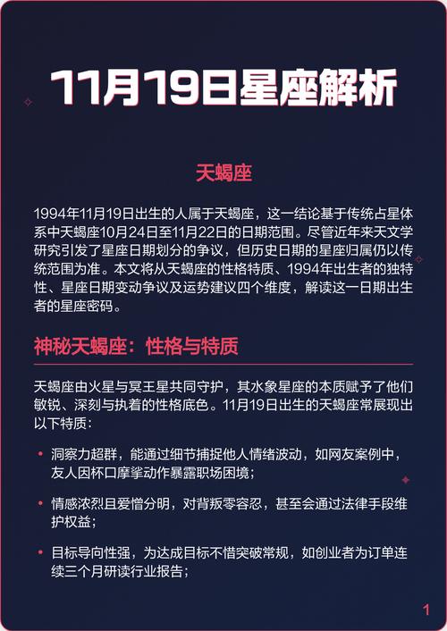 站在2026年丙午马年的岁首,回望星辰运转的轨迹,每一个出生日期都承载着独特的宇宙编码、11月19日,这个日期在黄道十二宫中处于天蝎座的核心地带,确切说是天蝎座的第三区间、这不仅是一个关于意志与权力的坐标,更是一个充满了破茧成蝶、涅槃重生意味的神奇时刻、作为一名研习命理与风水多年的术士,我将从星象格局、阴阳五行以及乾坤运转的深度视角,剖析11月19日出生者的命运底色,并揭秘那个在冥冥之中真正能克制天蝎座、令其无处遁形的唯一星座。