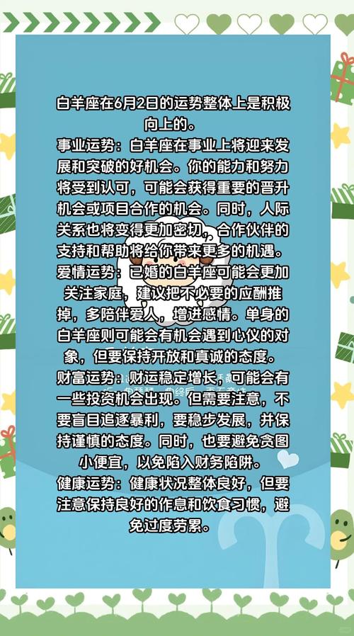 职场中的人际关系是今日的重头戏、白羊座往往心直口快,但在2026年6月2日,这种性格会让你吃亏、子水主智慧、主隐匿,今日适合多听少说、如果你有重要的合同要签,或者有重要的方案要呈报,尽量选择在下午的申时(15:00-17:00)进行,因为申金可以生子水,形成金生水、水克火的循环,有助于你通过理性的逻辑说服对方。